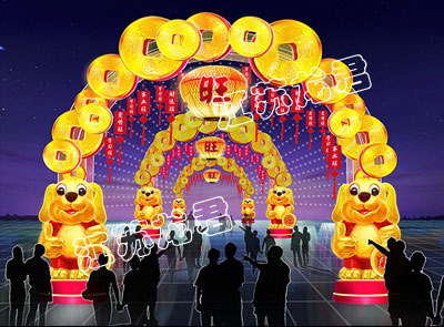 創(chuàng)意說明:狗狗造型和金元寶組成通道彩燈,寓意狗年財運滾滾,旺氣生財,搭配使用祝福掛簽,新年祝福滿滿。
